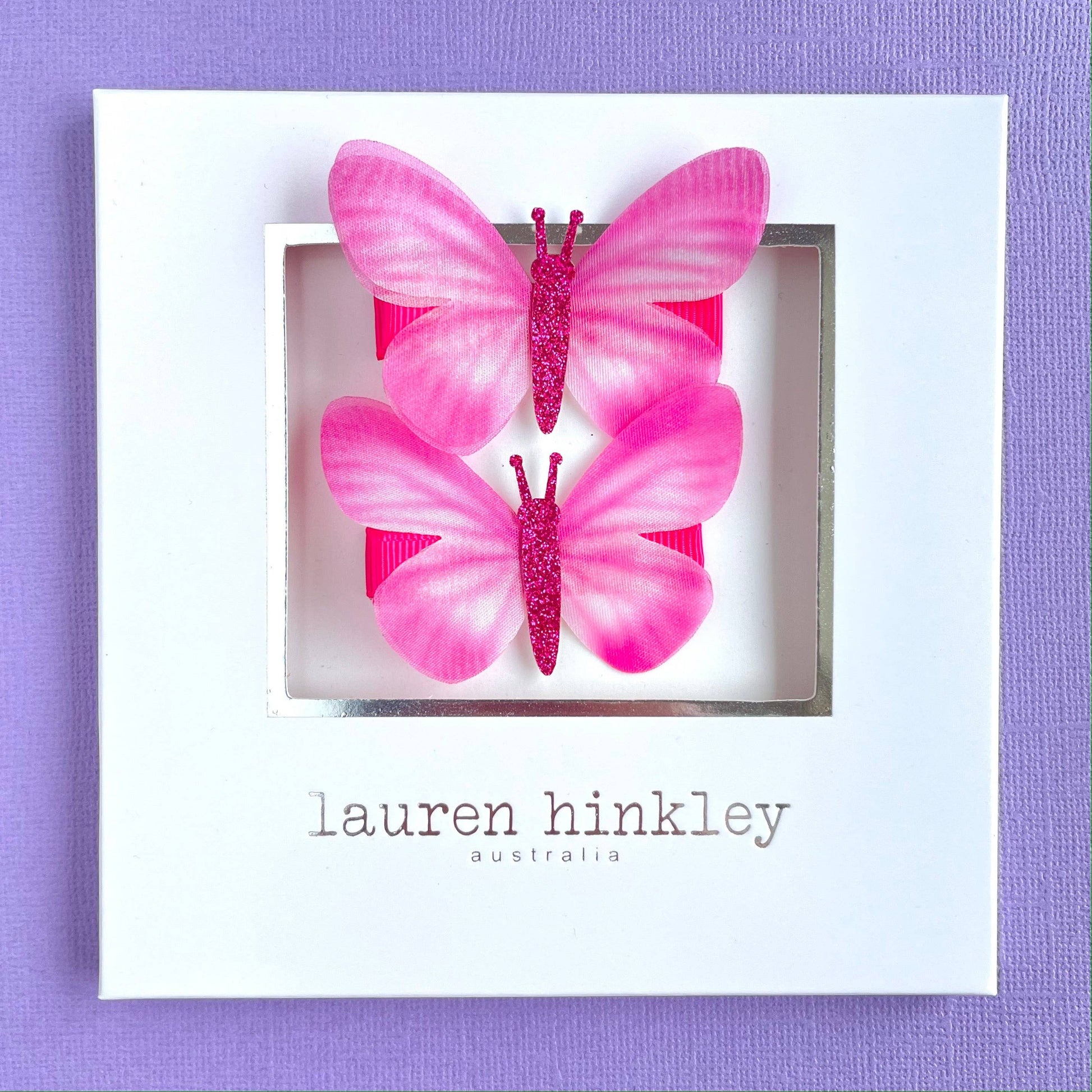 Queen Pink Butterfly Clips are a must for a carefree spirit, full of energy, and looking for new adventures! Queen Pink is a kind of deep pink that combined with the beauty of butterflies evokes feelings of happiness and friendship, creativity, and trustworthiness. The different hues of pink on the wings and the glittery body of the butterfly look stunning, making this the perfect gift for an equally dazzling little one.